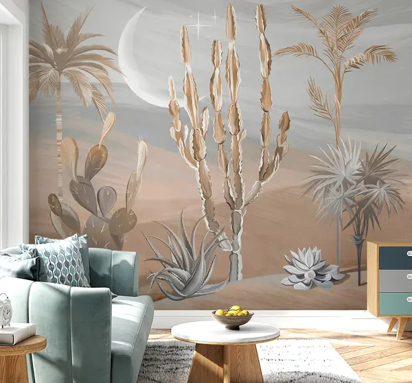 3D desert with cacti and tropical leaves - Wall mural (No. u96444)