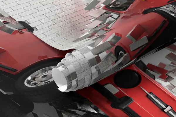 Red retro car breaks through a light brick wall - Wall mural (No. u96599)