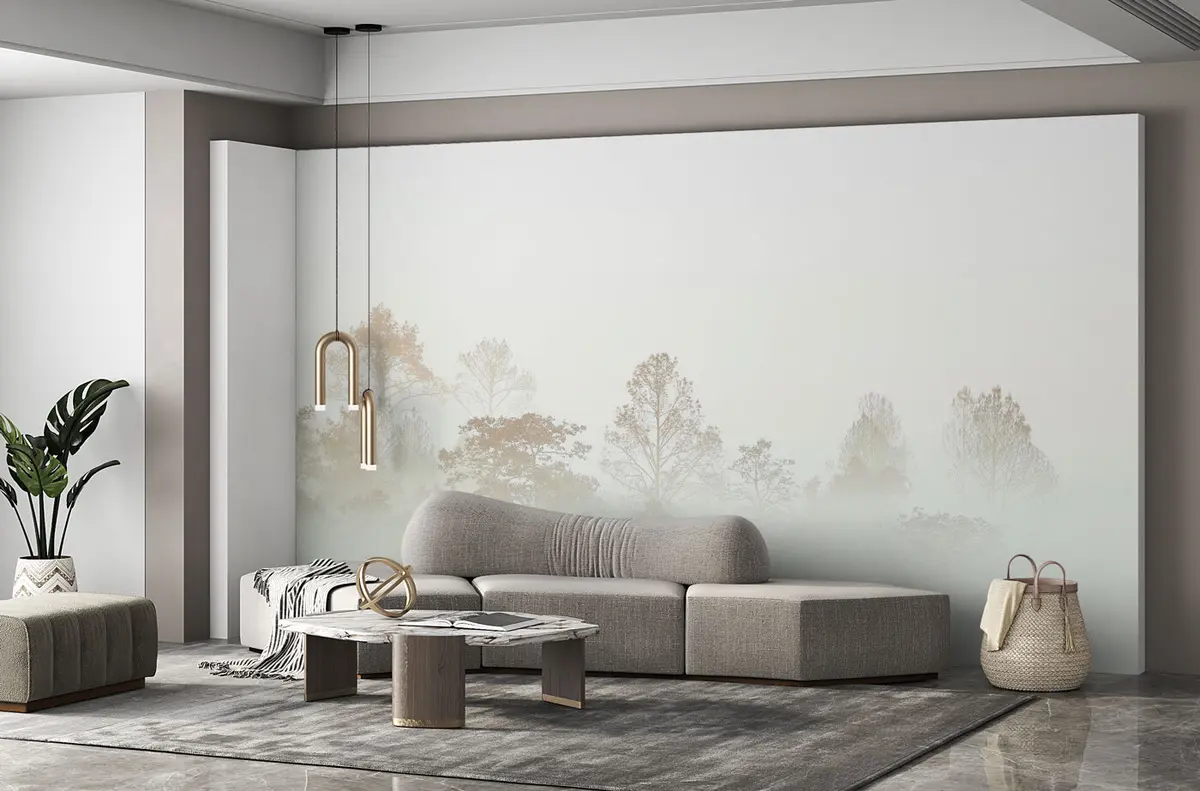 Silhouette of a grove of trees in thick white morning fog - Wall mural (No. u97405)