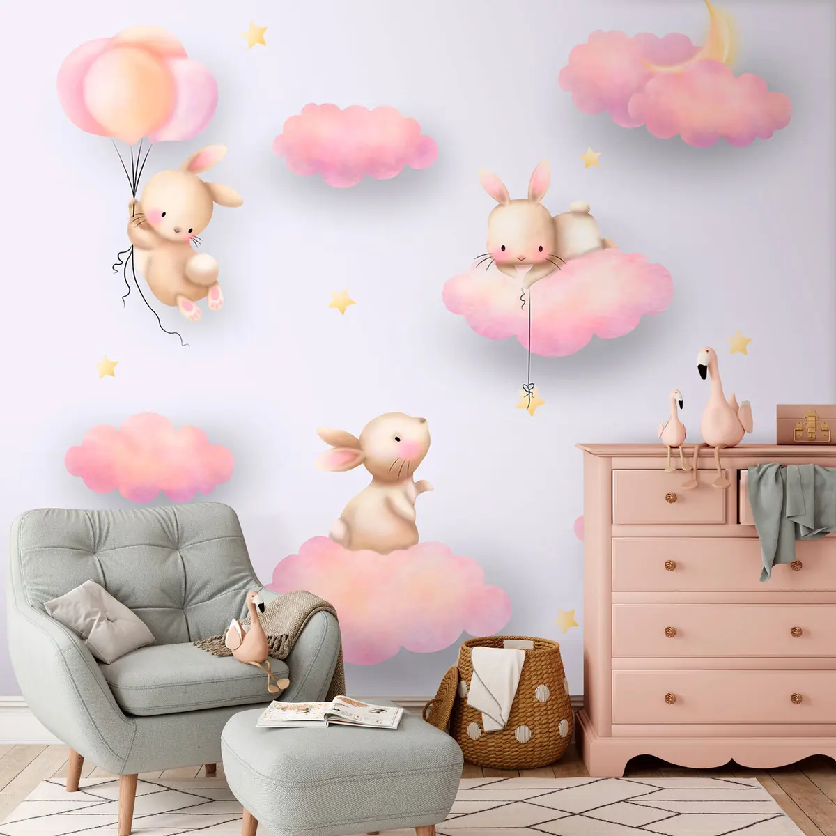 Bunnies on the clouds in children's style - Wall mural (No. u96613)