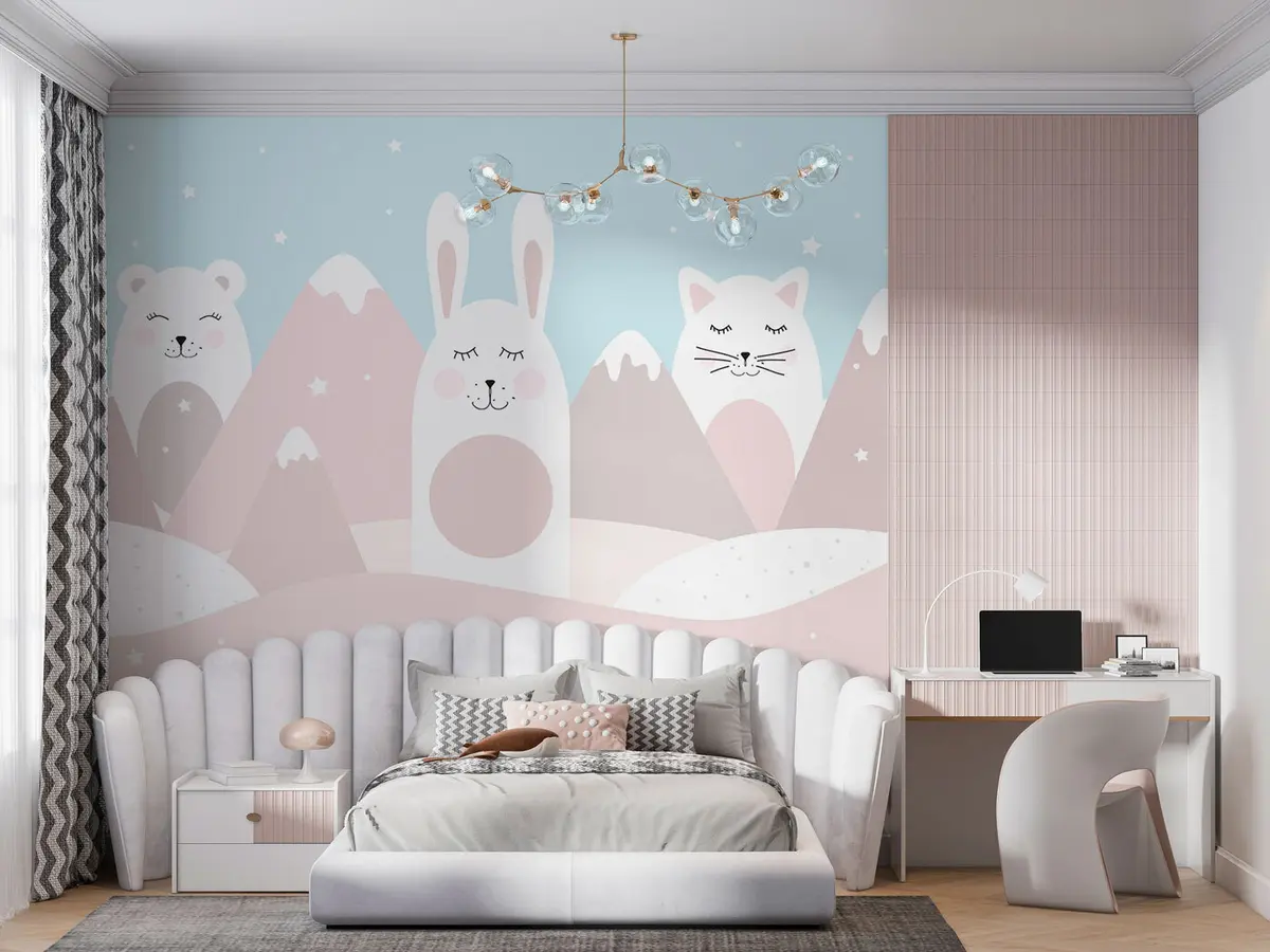 Rabbit, bear, fox on the background of beige snow-covered mountains - Wall mural (No. u98135)