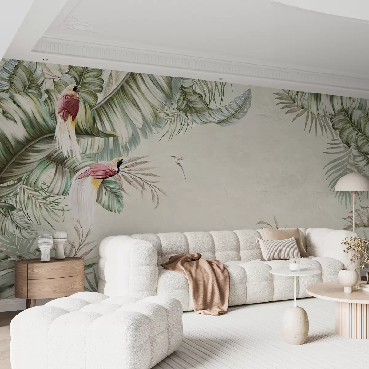 Tropical plants and birds on textured background - Wall mural (No. u96550)