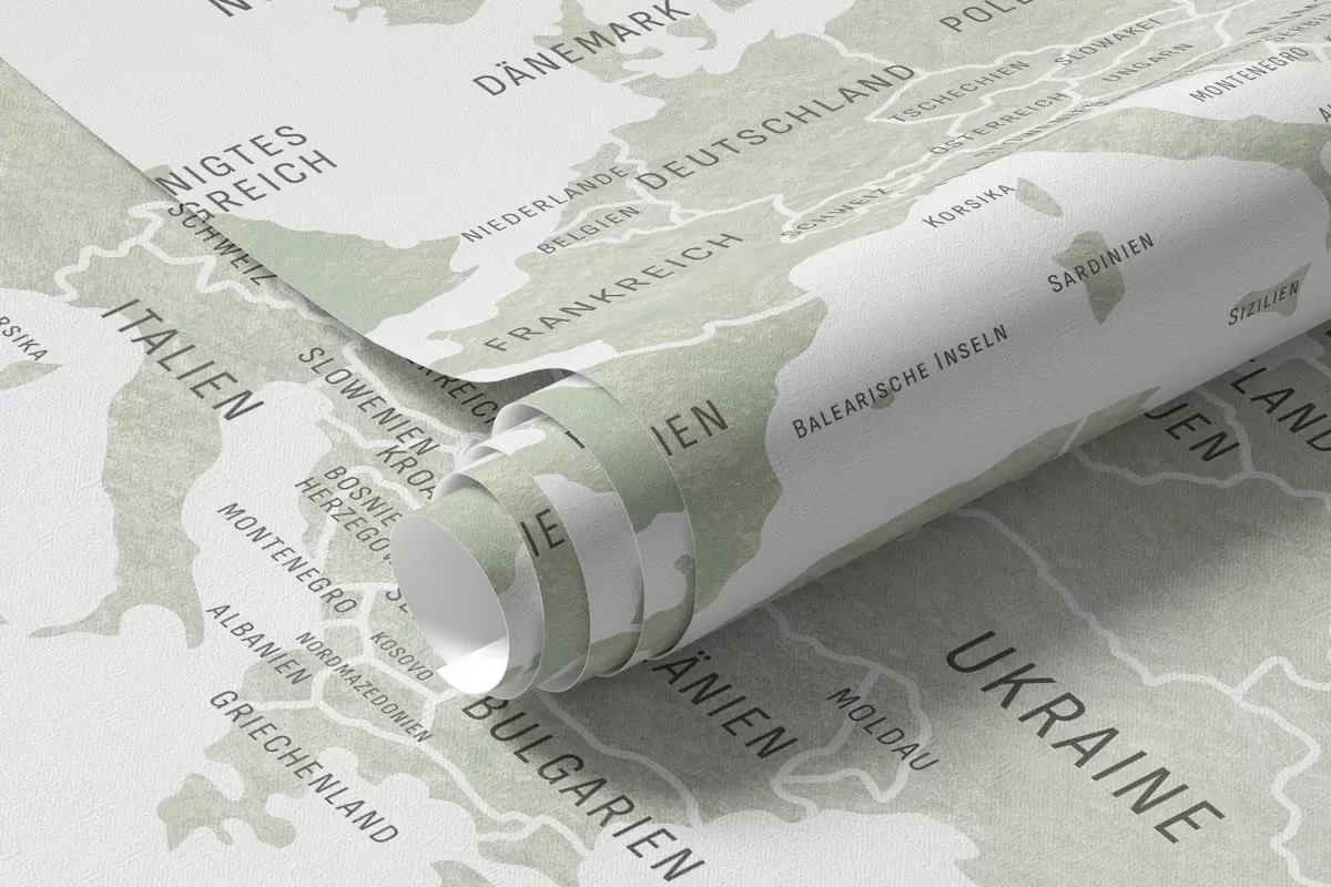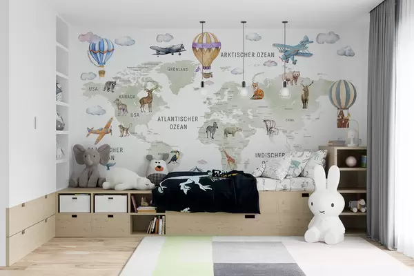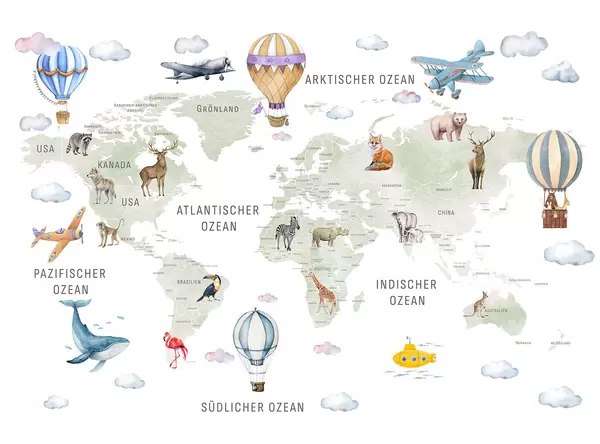 Children's map in watercolour style with animals and hot air balloons. German language. Green colour. - Wall mural (No. c00001de)