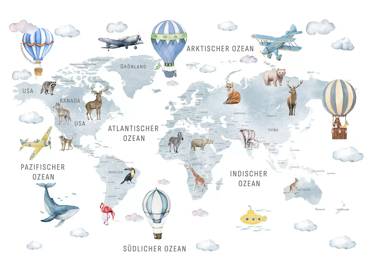 Children's map in watercolour style with animals and hot air balloons. German language. Blue colour. - Wall mural (No. c00001dev1)
