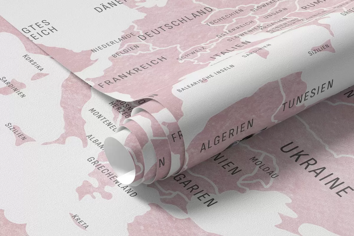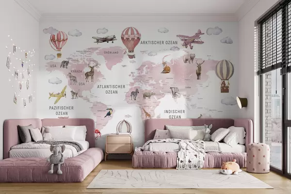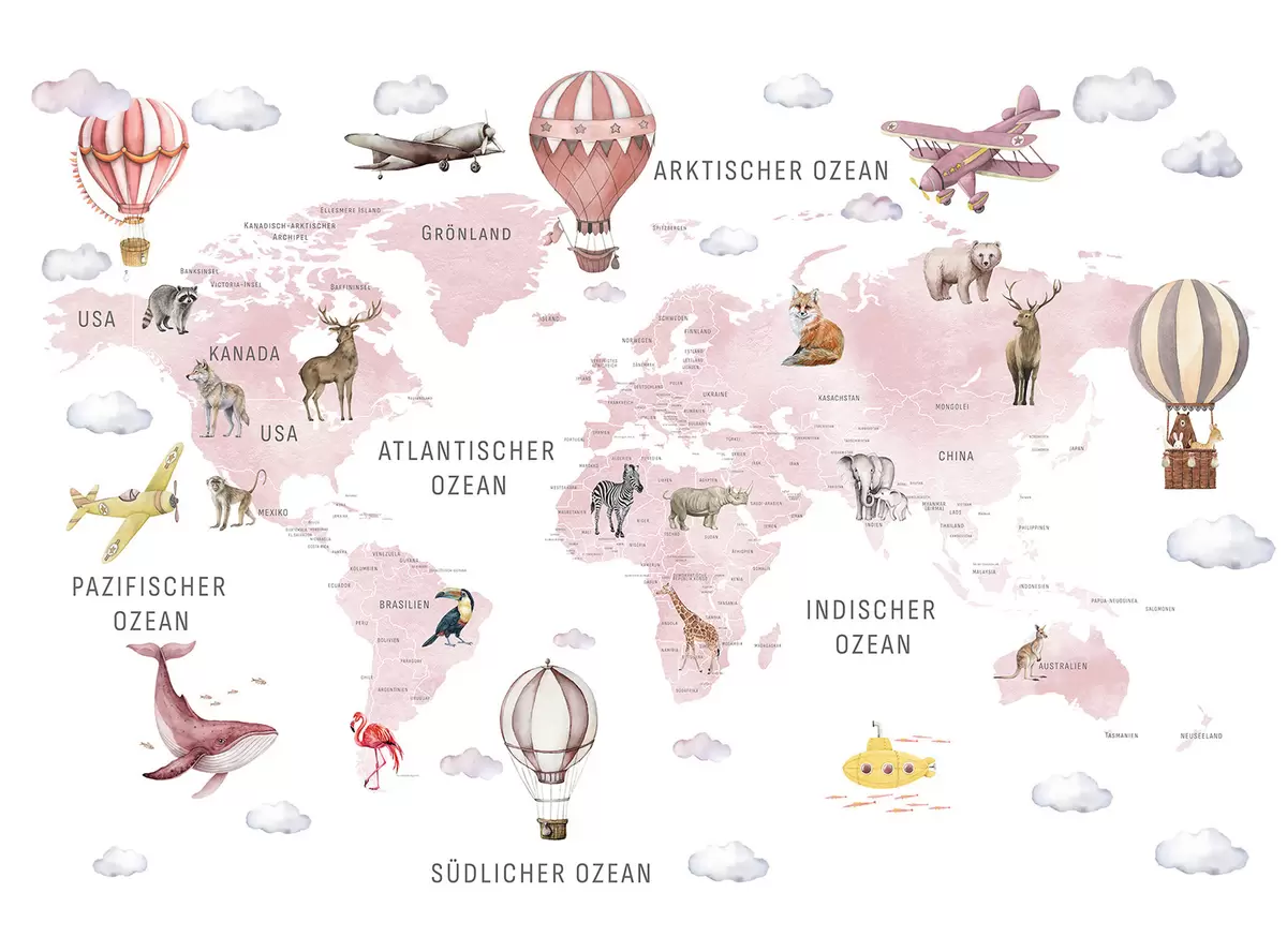 Children's map in watercolour style with animals and hot air balloons. German language. Pink colour. - Wall mural (No. c00001dev3)