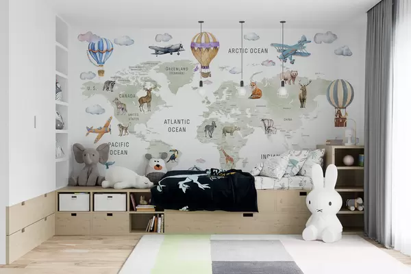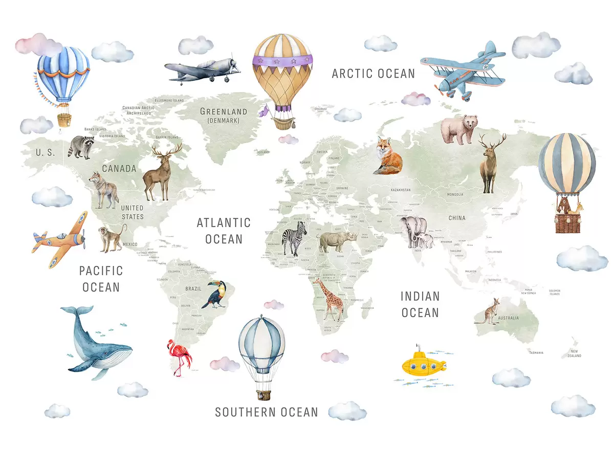 Children's map in watercolour style with animals and hot air balloons. English language. Green colour. - Wall mural (No. c00001en)