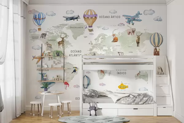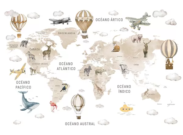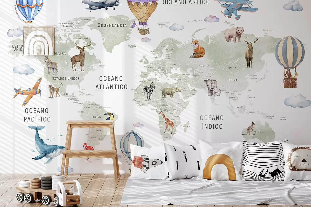 Children's map in watercolour style with animals and hot air balloons. Spanish language. Green colour. - Wall mural (No. c00001es)