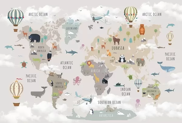 Children's world map with animals and hot air balloons. English language - Wall mural (No. c00002en)