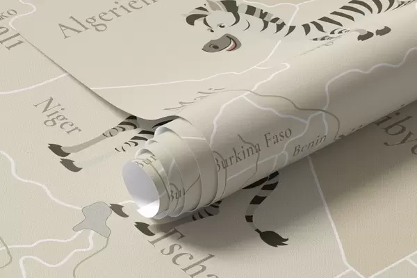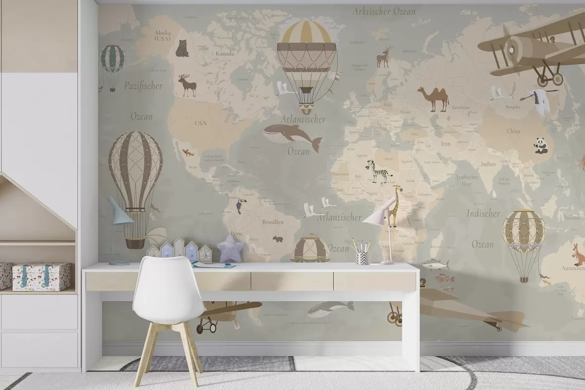 Children's world map with animals, airplanes, and hot air balloons. German language. Beige color - Wall mural (No. c00003de)