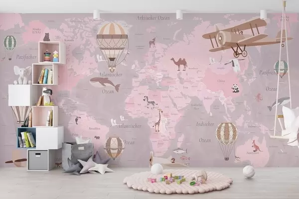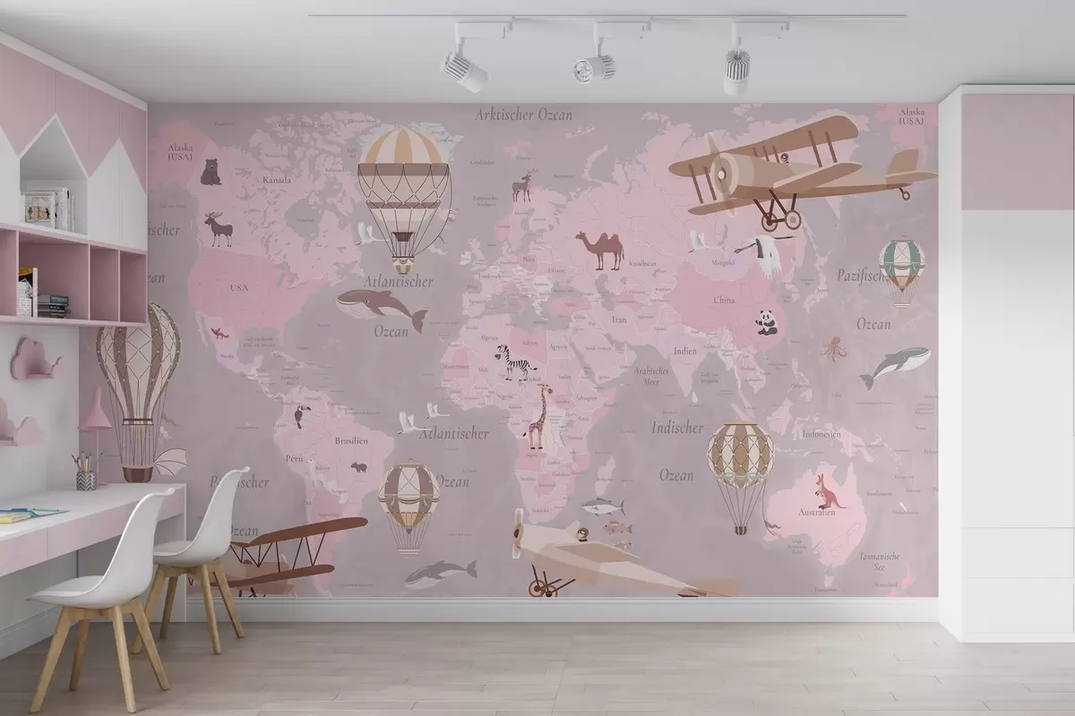 Children's world map with animals, airplanes, and hot air balloons. German language. Pink color - Wall mural (No. c00003dev3)