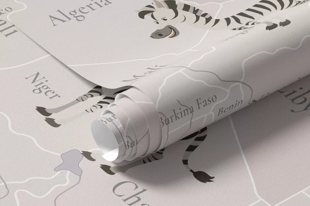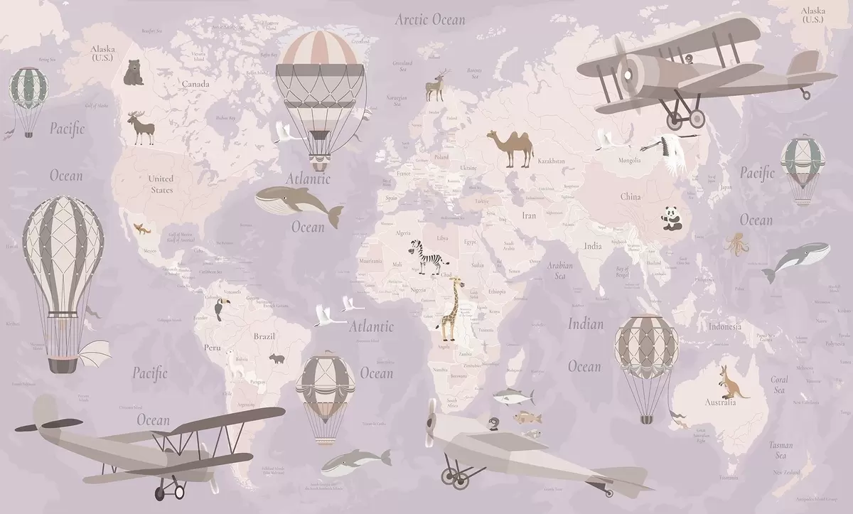 Children's world map with animals, airplanes, and hot air balloons. English language. Purple color - Wall mural (No. c00003env4)