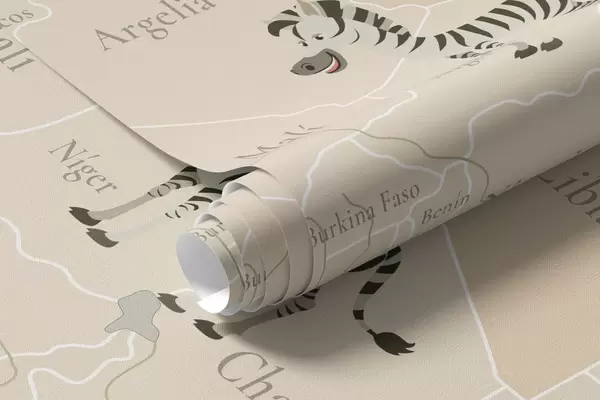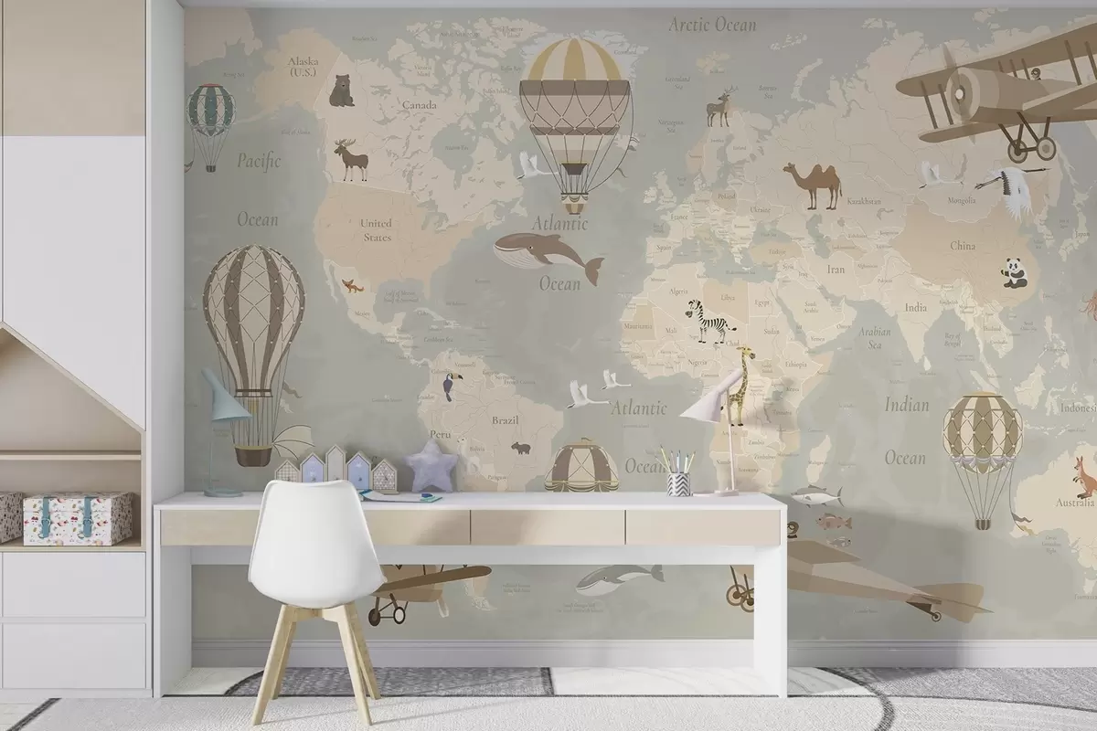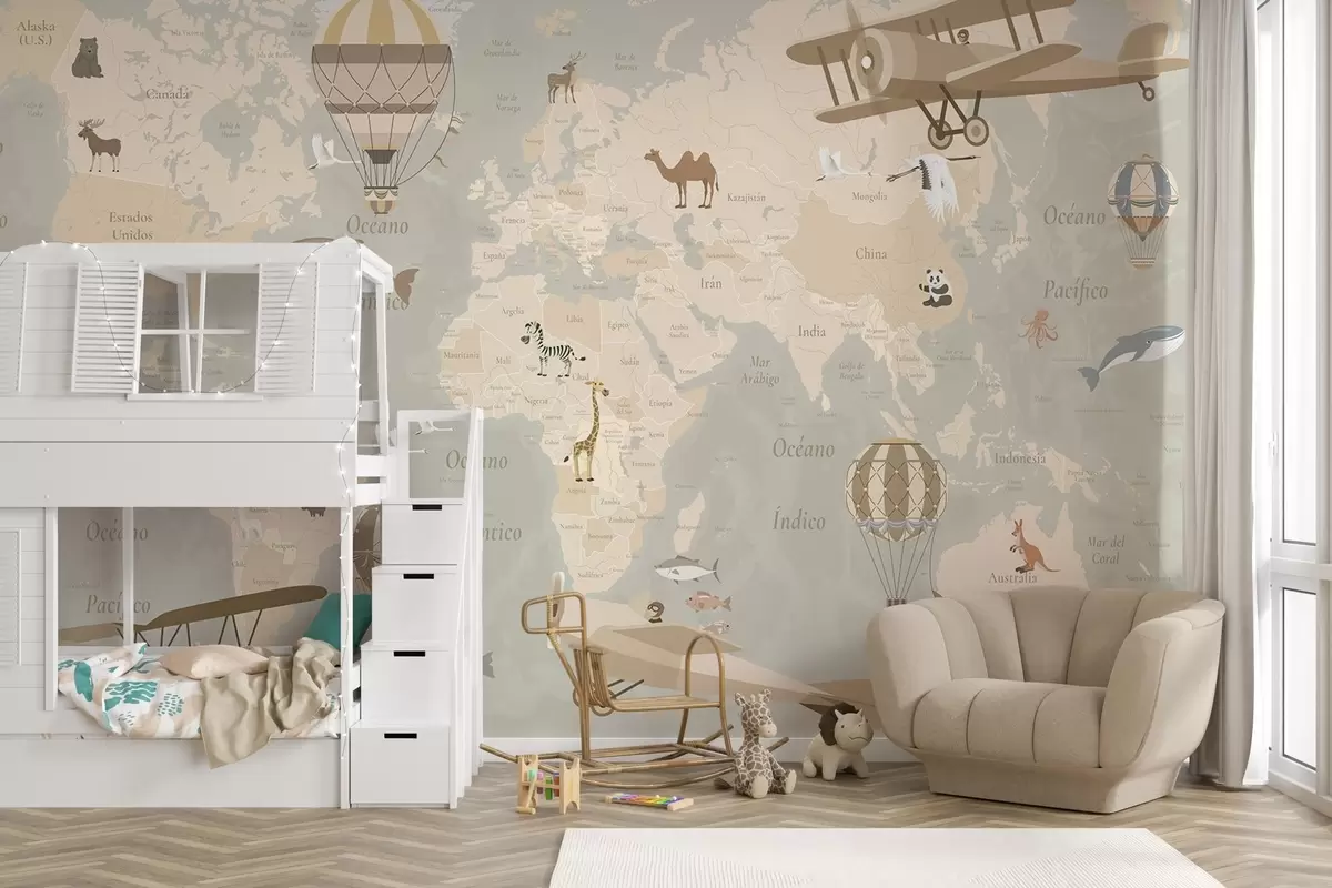 Children's world map with animals, airplanes, and hot air balloons. Spanish language. Beige color - Wall mural (No. c00003es)