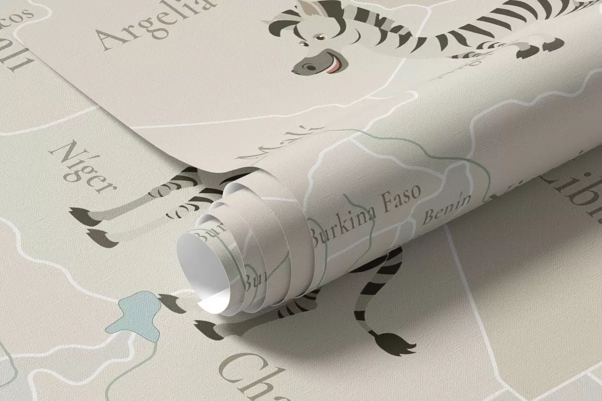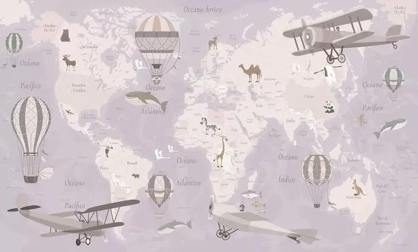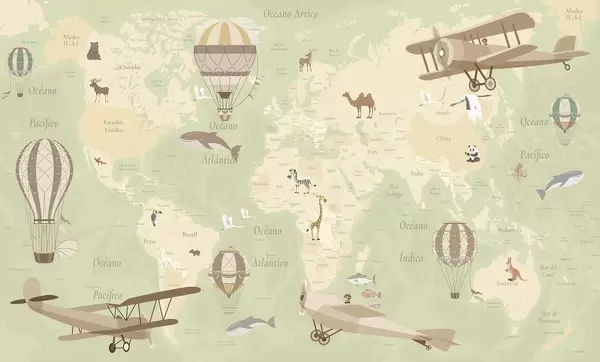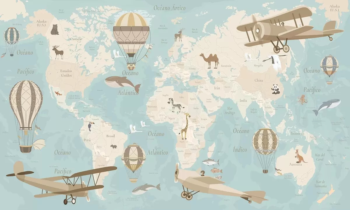 Children's world map with animals, airplanes, and hot air balloons. Spanish language. Blue color - Wall mural (No. c00003esv1)