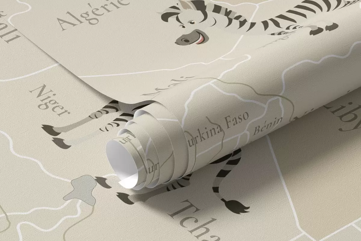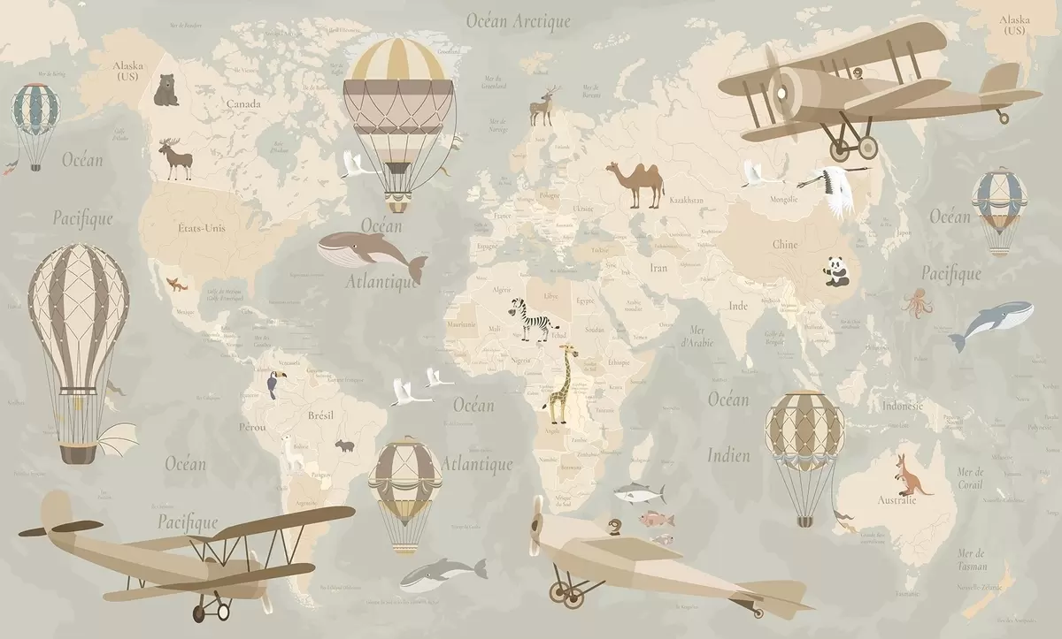Children's world map with animals, airplanes, and hot air balloons. French language. Beige color - Wall mural (No. c00003fr)