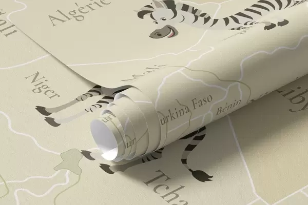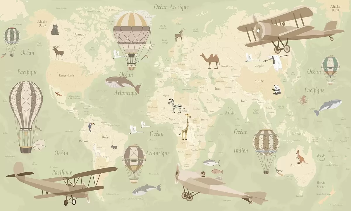 Children's world map with animals, airplanes, and hot air balloons. French language. Green color - Wall mural (No. c00003frv2)