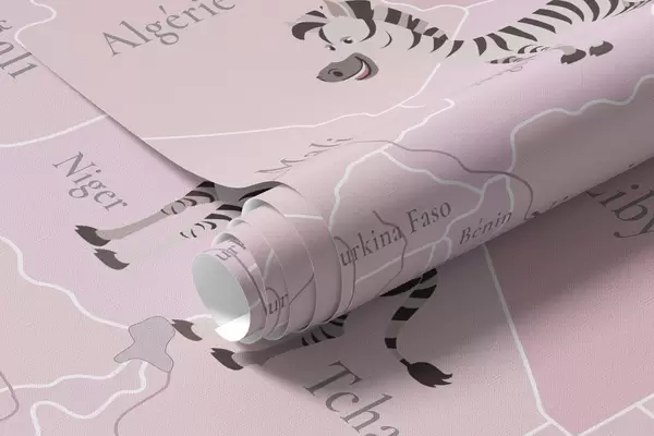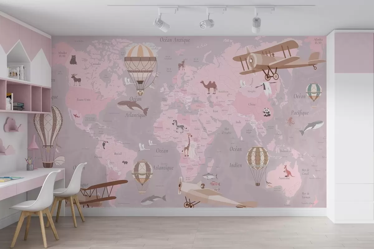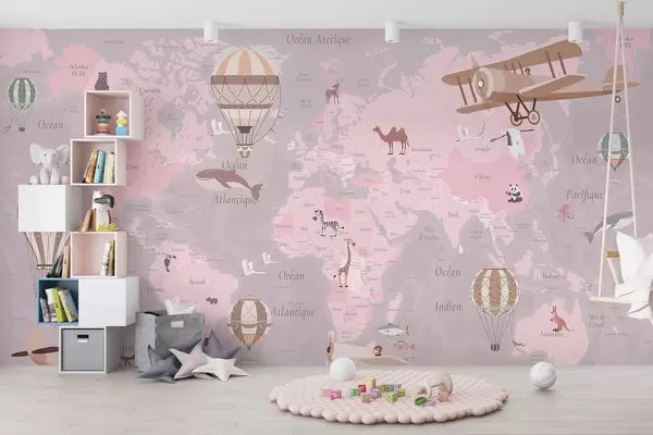 Children's world map with animals, airplanes, and hot air balloons. French language. Pink color - Wall mural (No. c00003frv3)