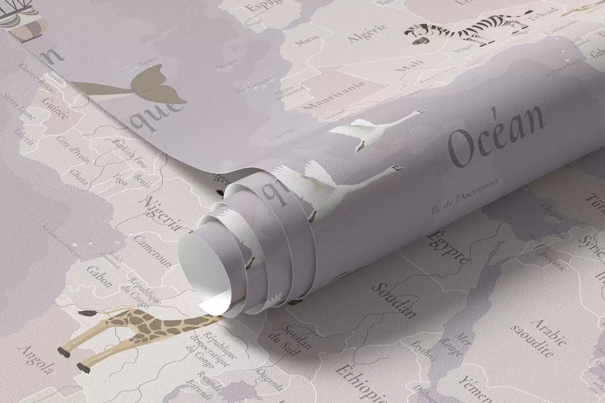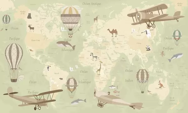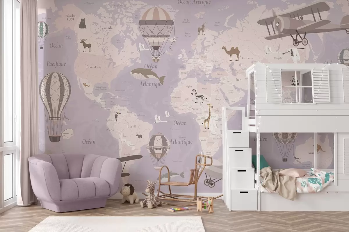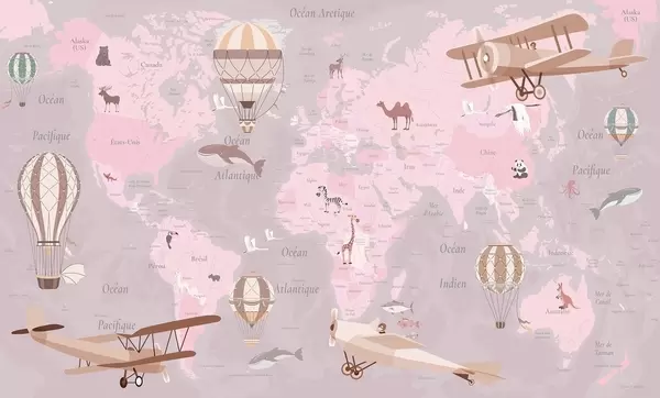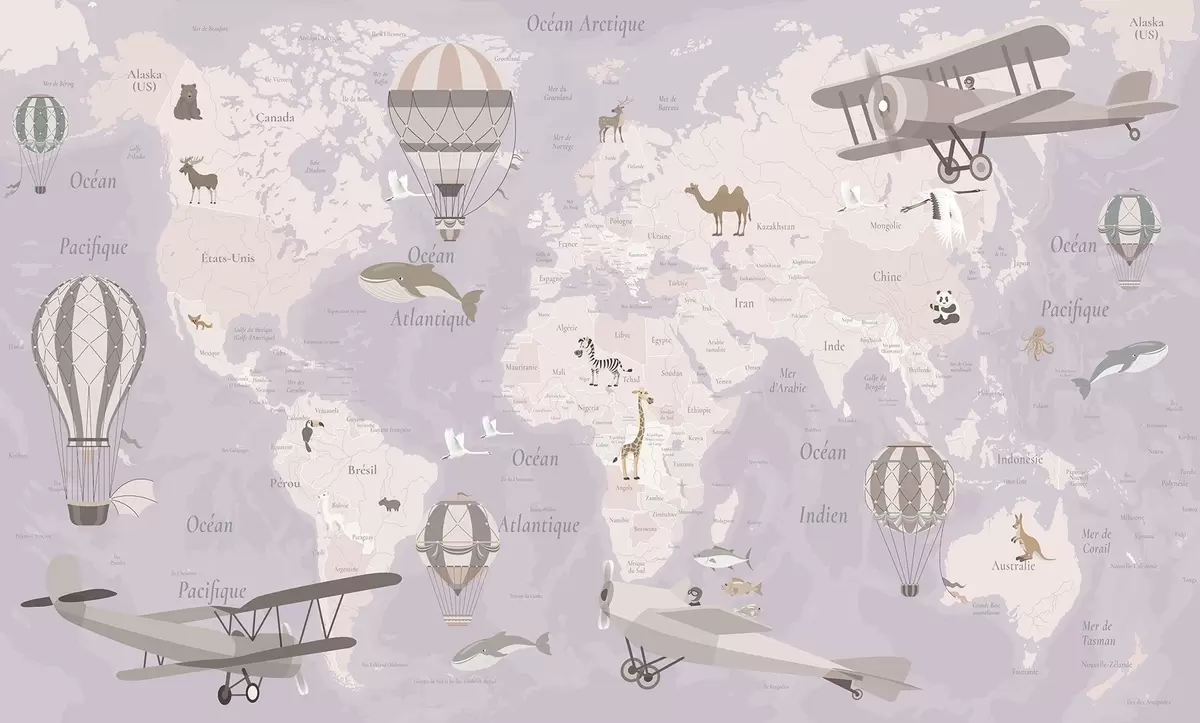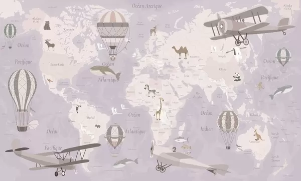 Children's world map with animals, airplanes, and hot air balloons. French language. Purple color - Wall mural (No. c00003frv4)