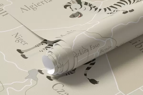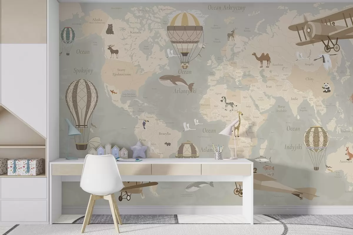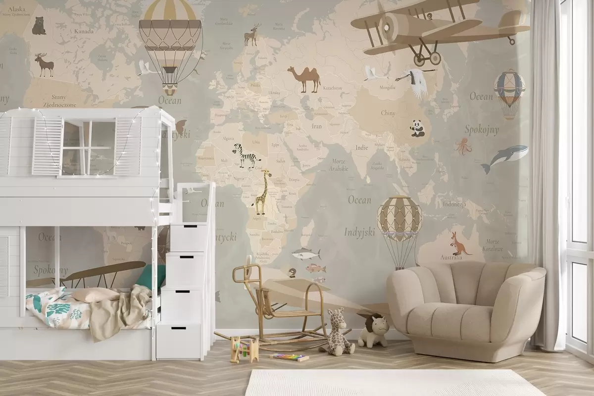Children's world map with animals, airplanes, and hot air balloons. Polish language. Beige color - Wall mural (No. c00003pl)