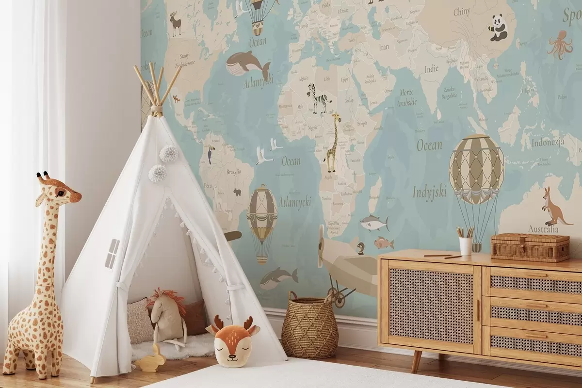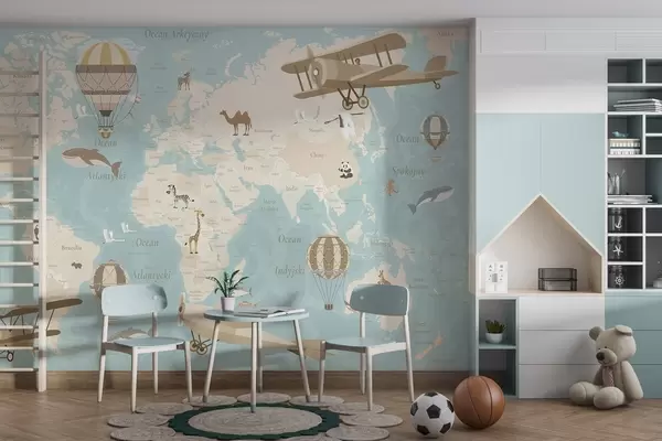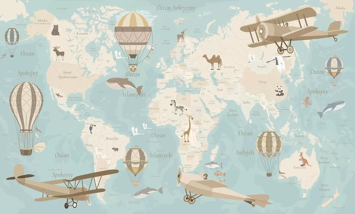 Children's world map with animals, airplanes, and hot air balloons. Polish language. Blue color - Wall mural (No. c00003plv1)