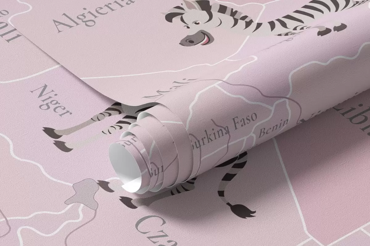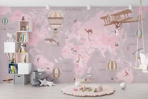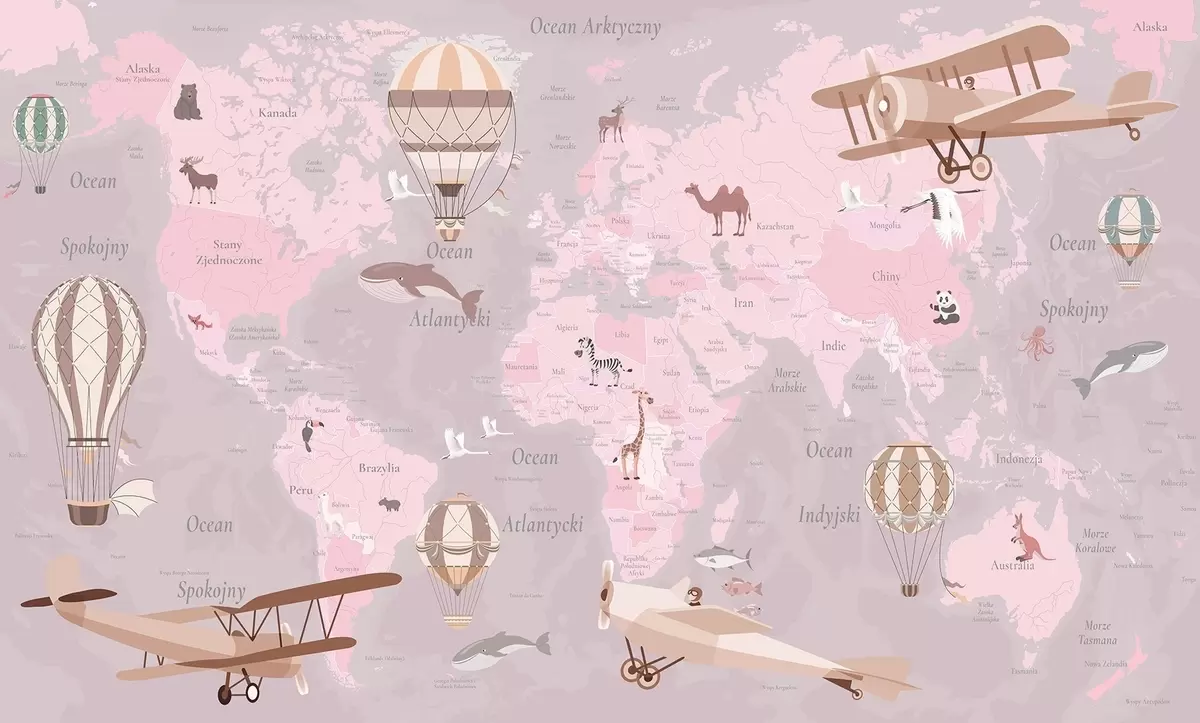 Children's world map with animals, airplanes, and hot air balloons. Polish language. Pink color - Wall mural (No. c00003plv3)