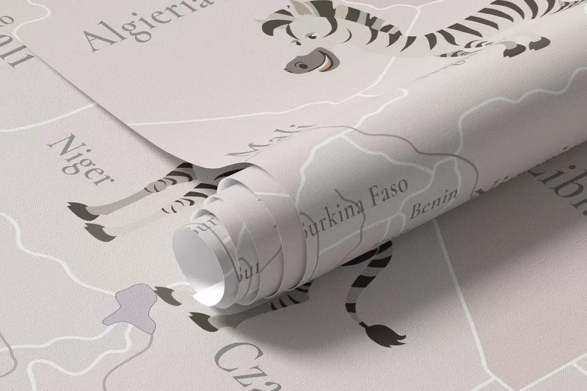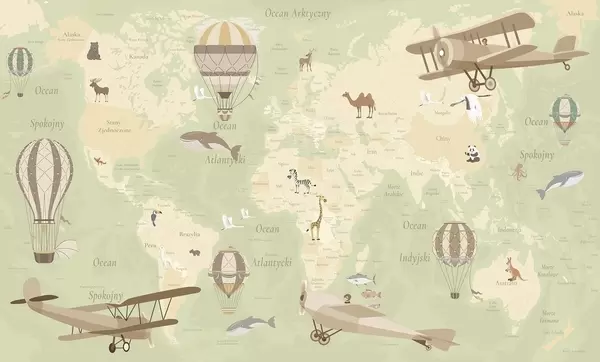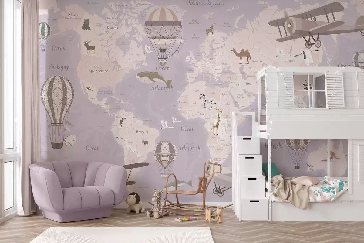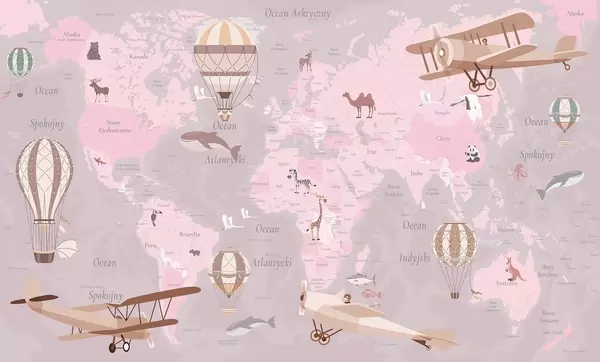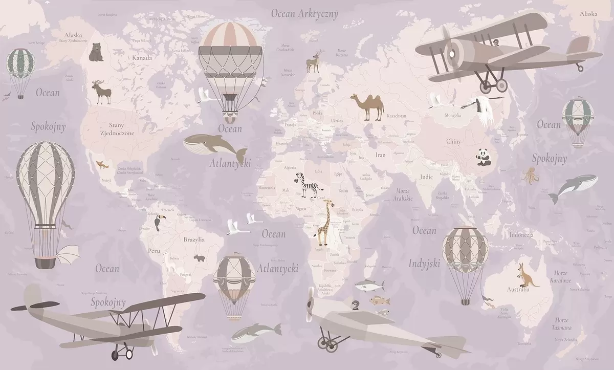 Children's world map with animals, airplanes, and hot air balloons. Polish language. Purple color - Wall mural (No. c00003plv4)