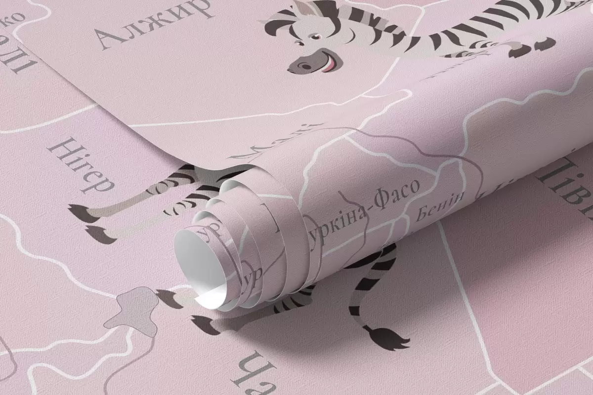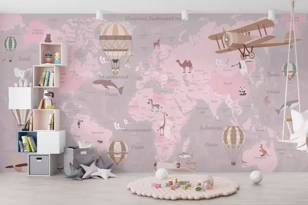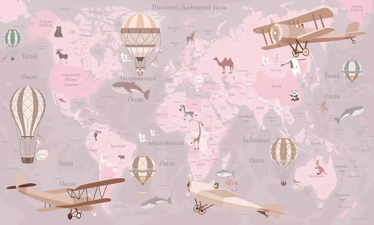 Children's world map with animals, airplanes, and hot air balloons. Ukrainian language. Pink color - Wall mural (No. c00003ukv3)