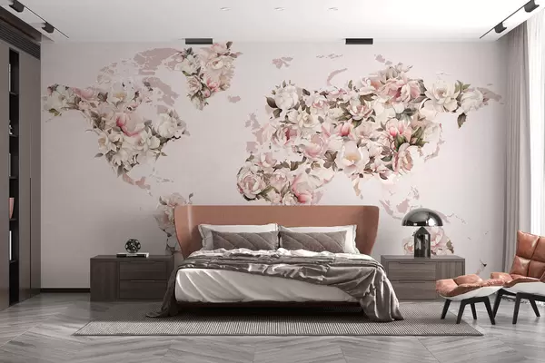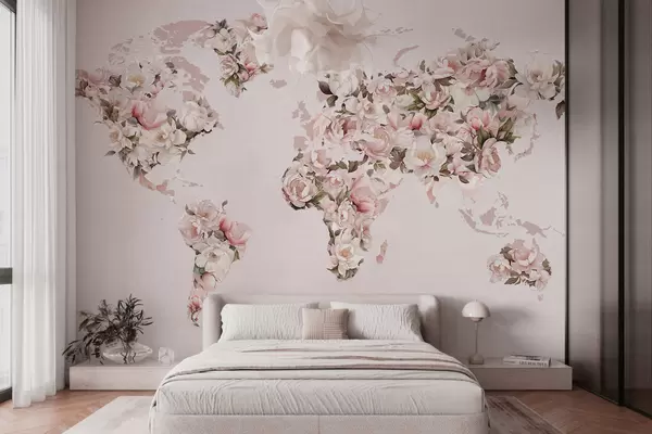 A pink world map made of large white and pink peonies - Wall mural (No. c00005)