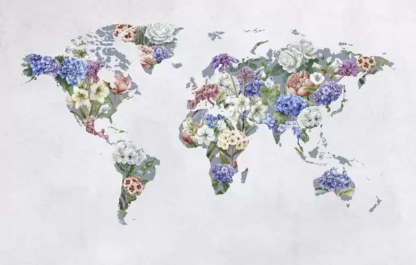 A colorful map of the world made from a variety of vibrant flowers - Wall mural (No. c00006)