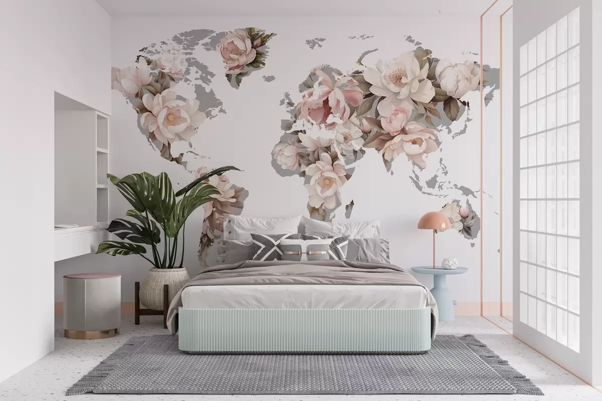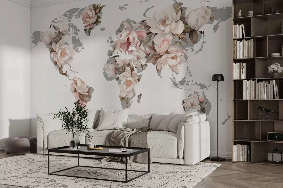 A delicate, creamy world map made of flowers - Wall mural (No. c00008)
