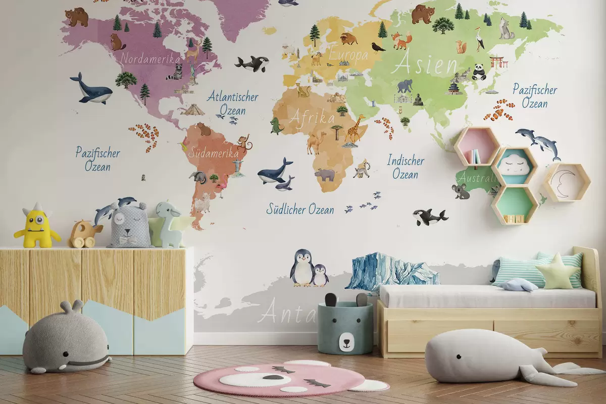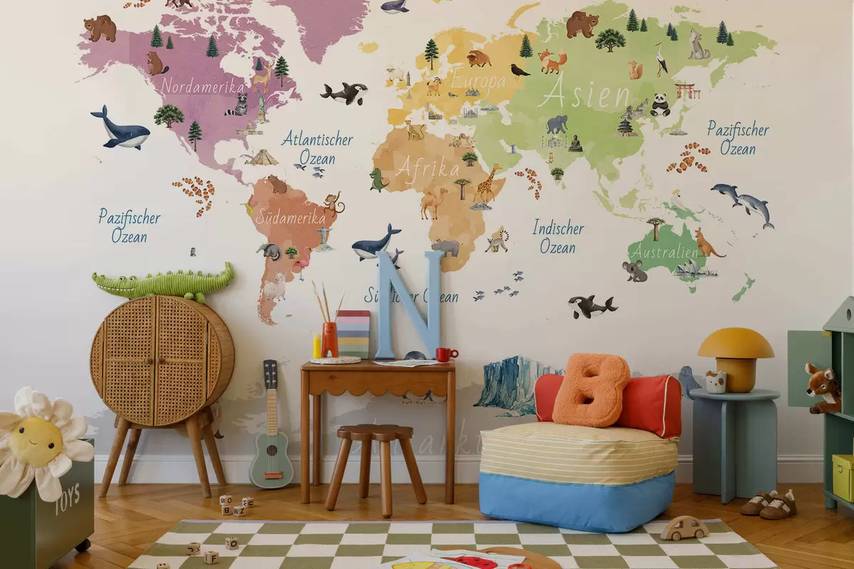 A watercolor-style color map featuring animals, plants, and architecture. Labels in German - Wall mural (No. c00009de)