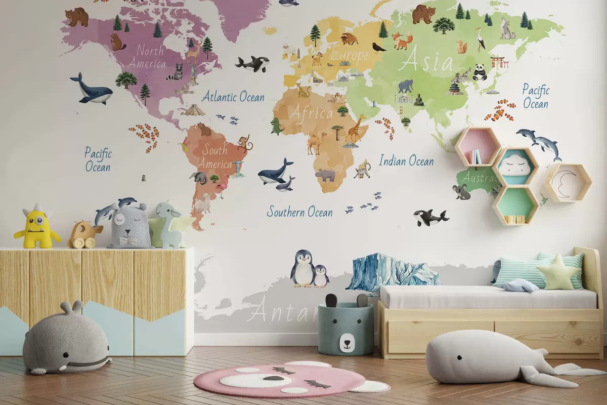 A watercolor-style color map featuring animals, plants, and architecture. Labels in English - Wall mural (No. c00009en)