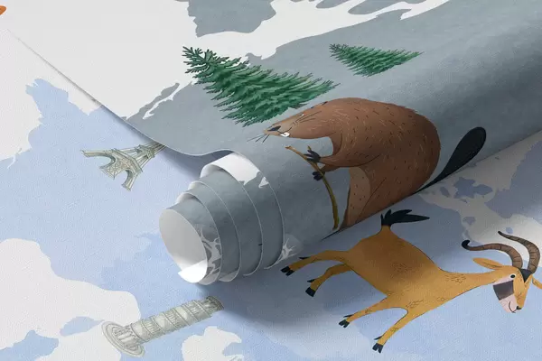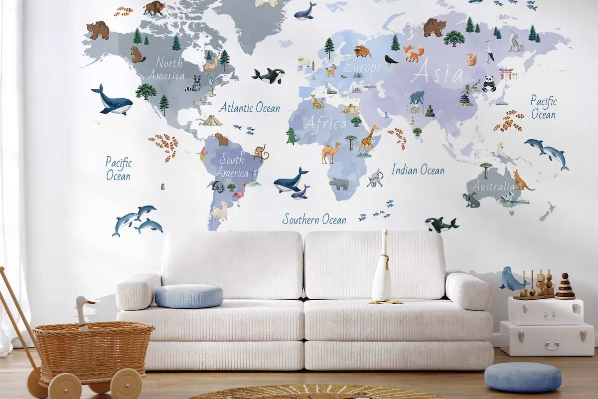 A watercolor-style Blue map featuring animals, plants, and architecture. Labels in English - Wall mural (No. c00009env1)