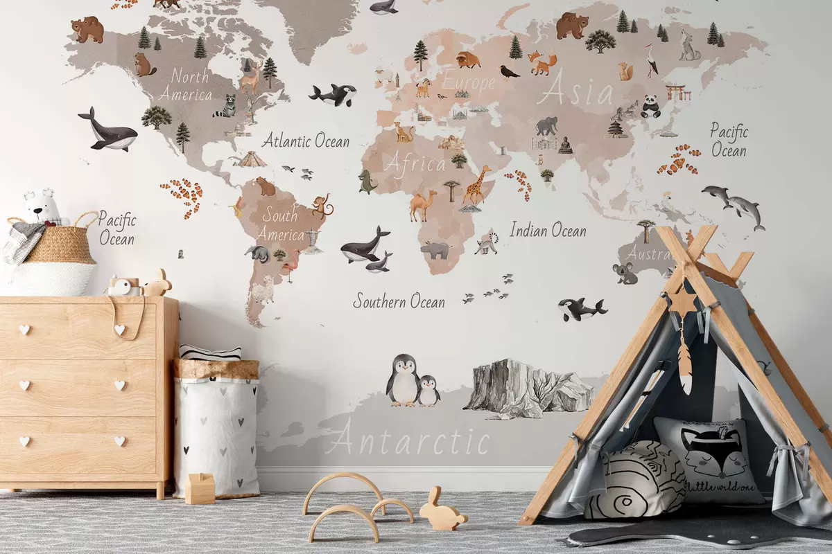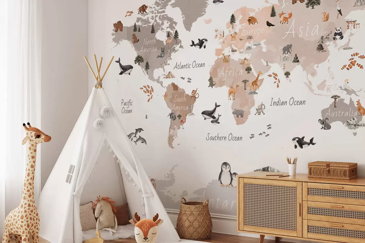 A watercolor-style Beige map featuring animals, plants, and architecture. Labels in English - Wall mural (No. c00009env3)