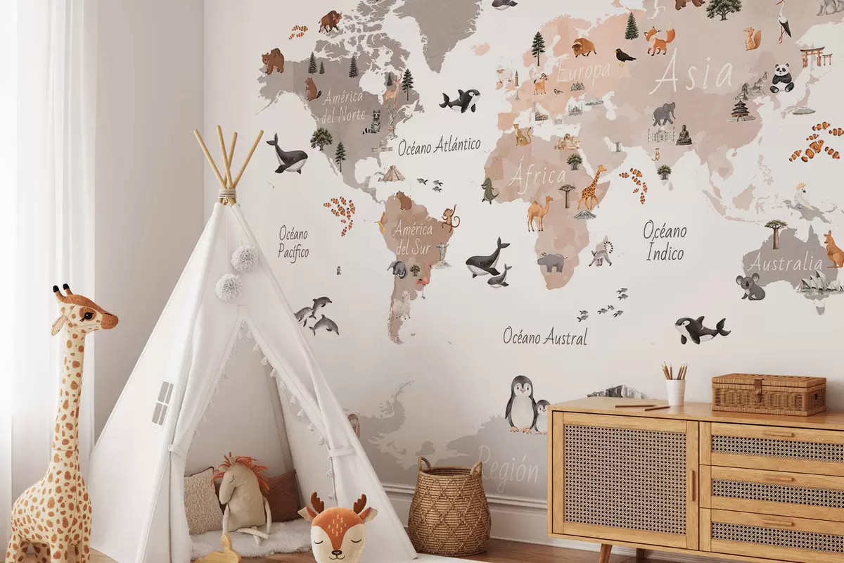 A watercolor-style Beige map featuring animals, plants, and architecture. Labels in Spanish - Wall mural (No. c00009esv3)