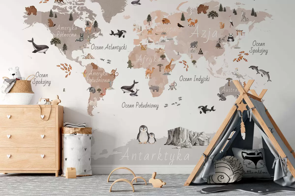 A watercolor-style Beige map featuring animals, plants, and architecture. Labels in Polish - Wall mural (No. c00009plv3)