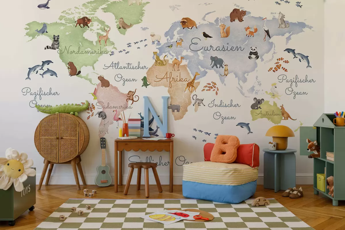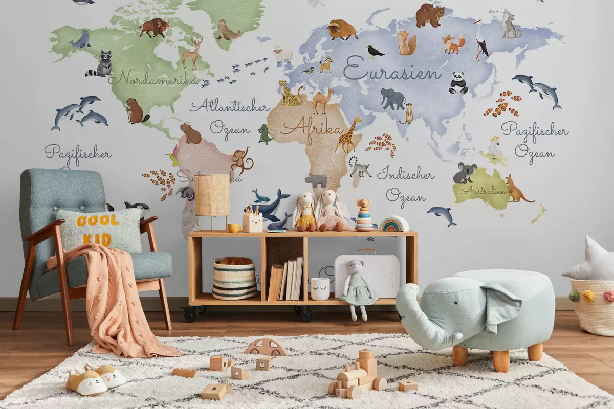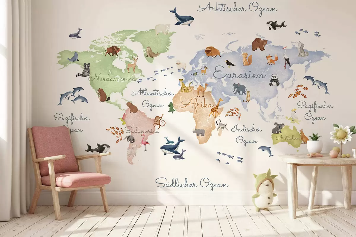 A watercolor-style White map featuring animals. Labels in German - Wall mural (No. c00012de)