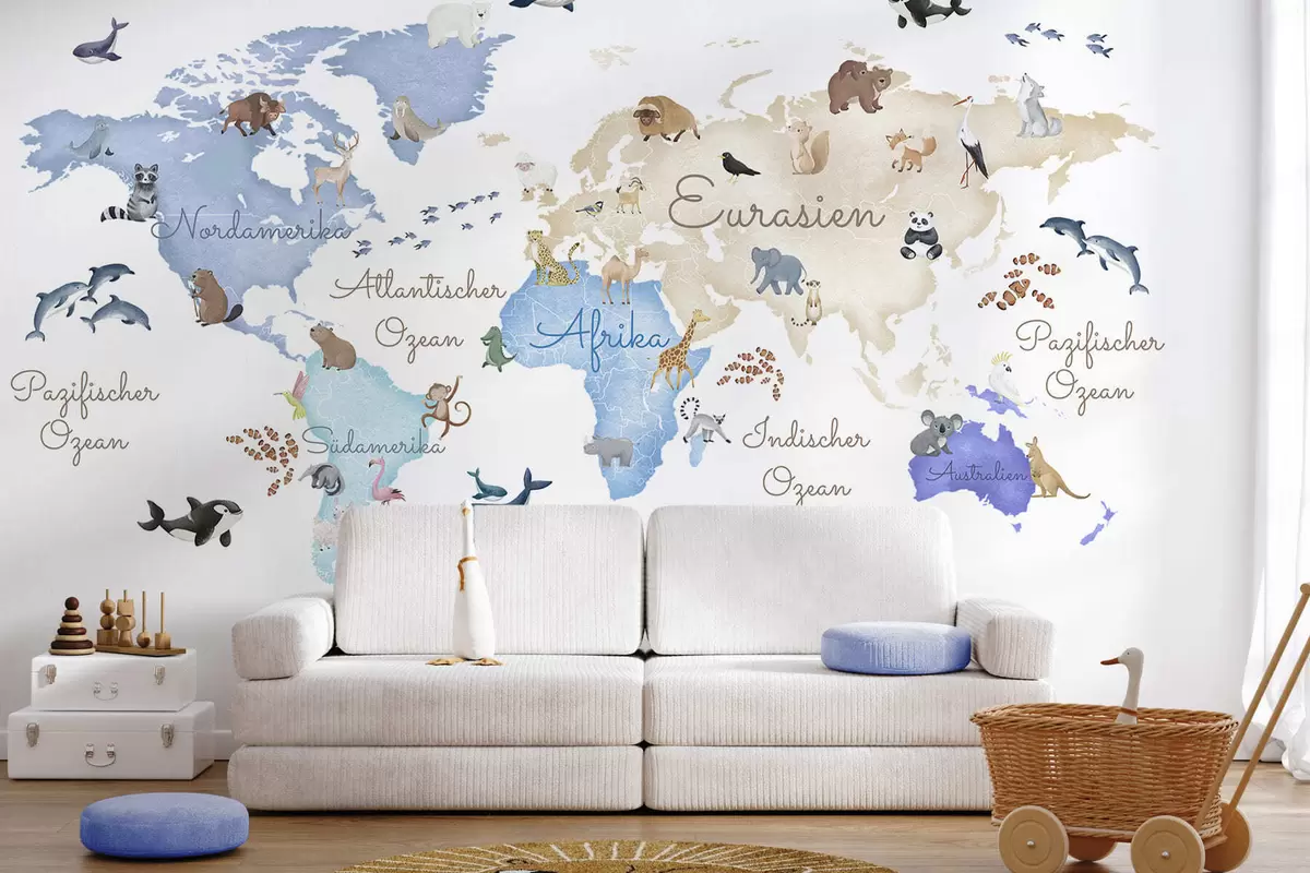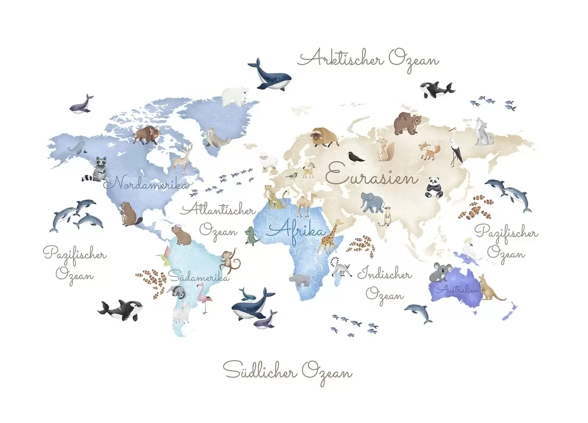 A watercolor-style Blue map featuring animals. Labels in German - Wall mural (No. c00012dev1)