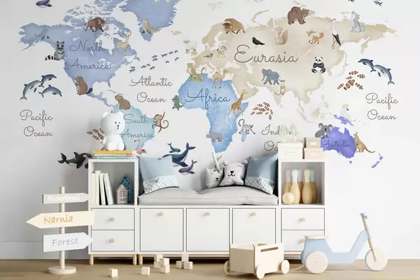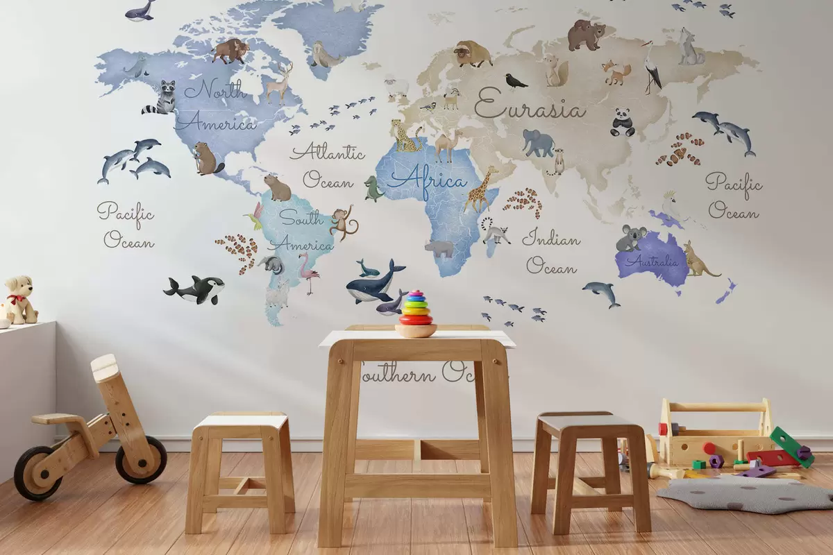 A watercolor-style Blue map featuring animals. Labels in English - Wall mural (No. c00012env1)