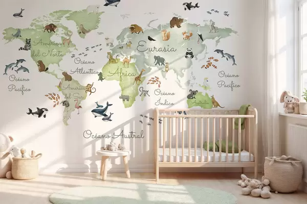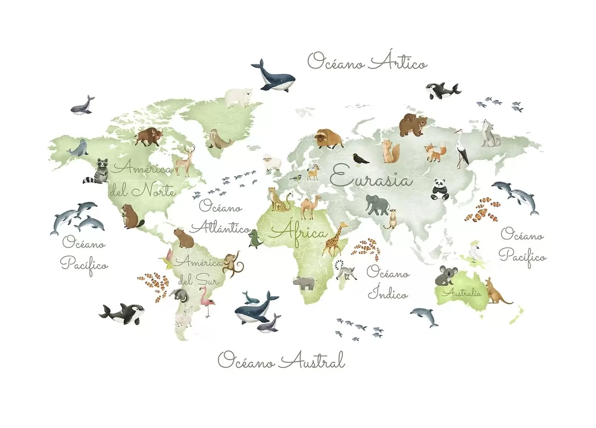 A watercolor-style Green map featuring animals. Labels in Spanish - Wall mural (No. c00012esv2)