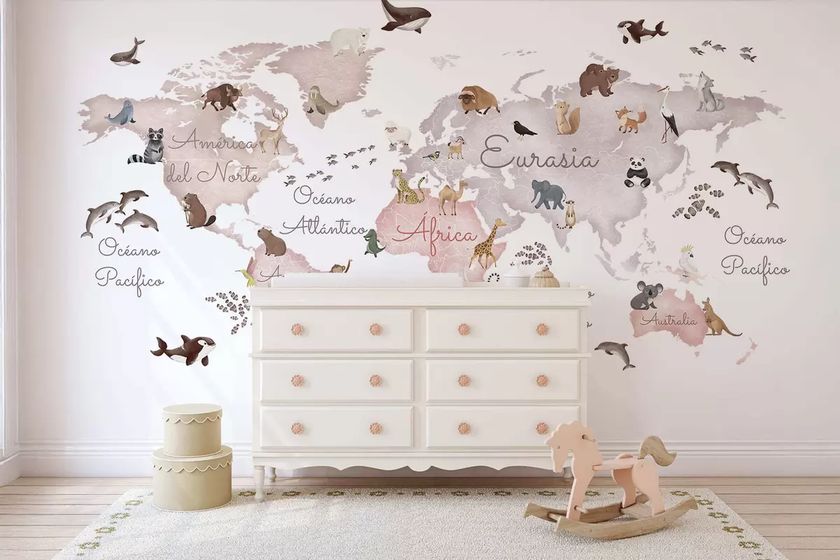 A watercolor-style Beige map featuring animals. Labels in Spanish - Wall mural (No. c00012esv3)