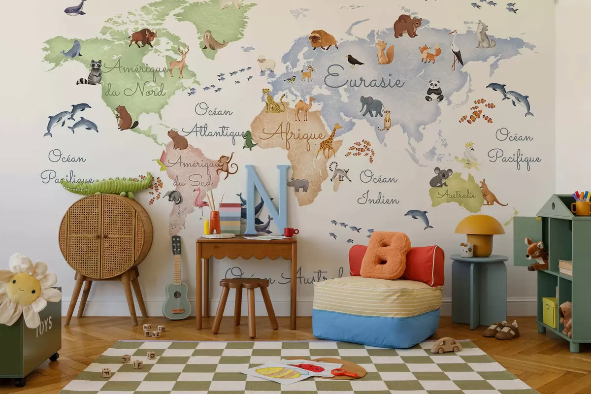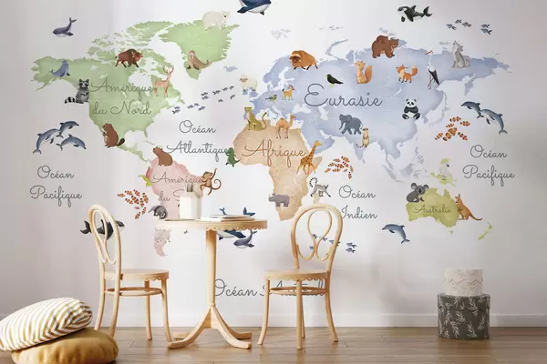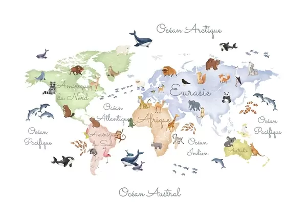 A watercolor-style color map featuring animals. Labels in French - Wall mural (No. c00012fr)