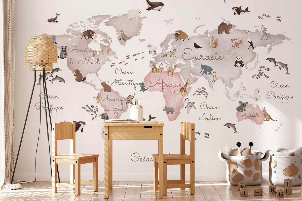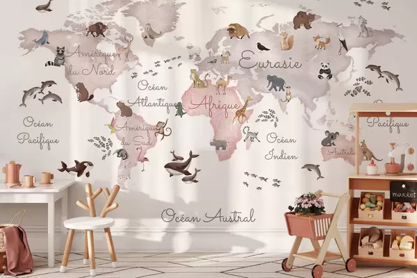 A watercolor-style Beige map featuring animals. Labels in French - Wall mural (No. c00012frv3)