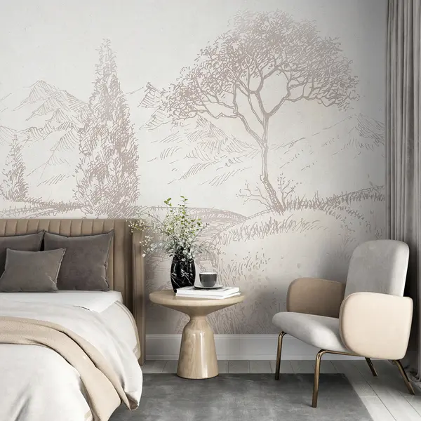 Toscana landscape, tree, field, minimalism, natural beige colors - Wall mural (No. u99570)