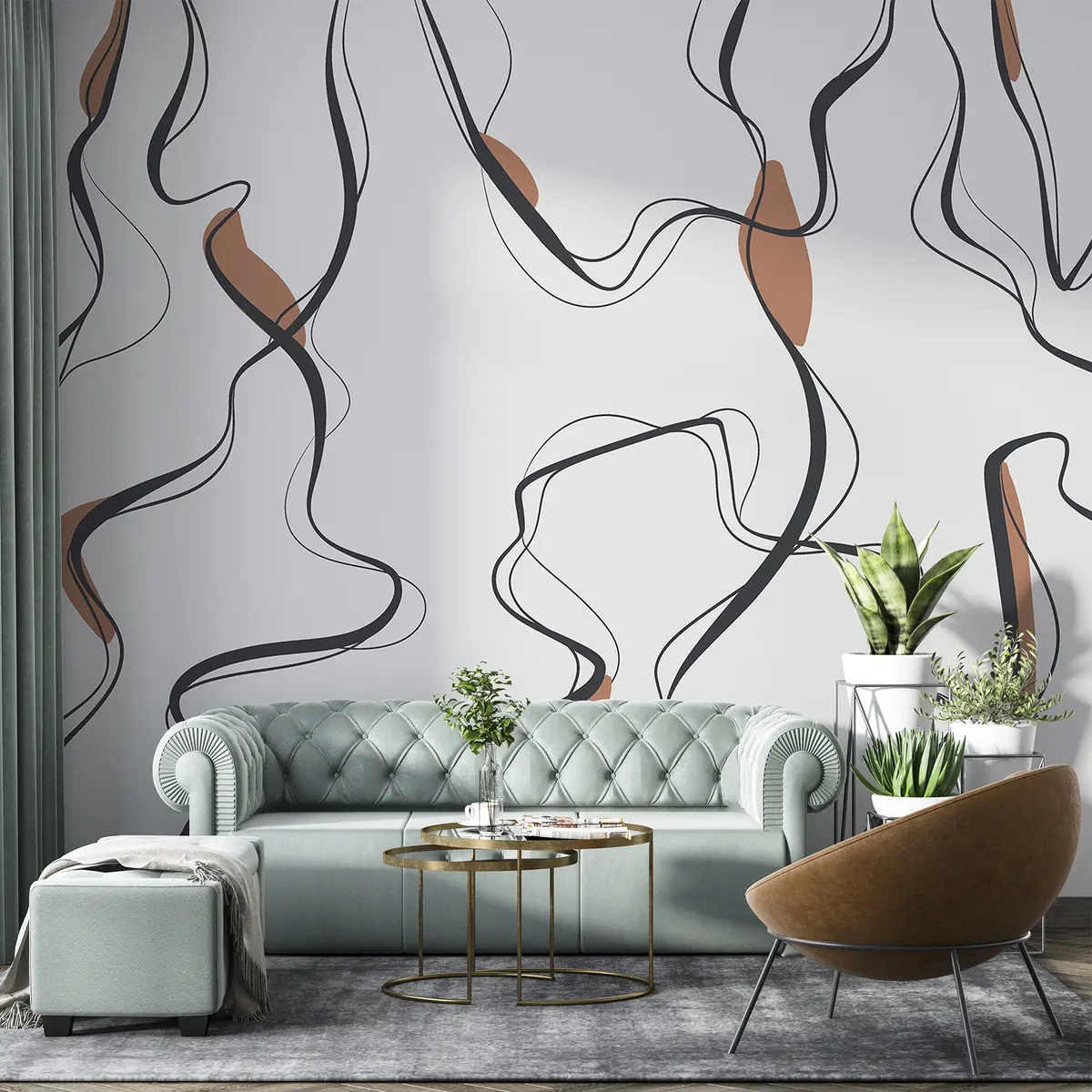 Ink drawing art, abstract pattern, geometric lines, grey and orange - Wall mural (No. u99659v3)