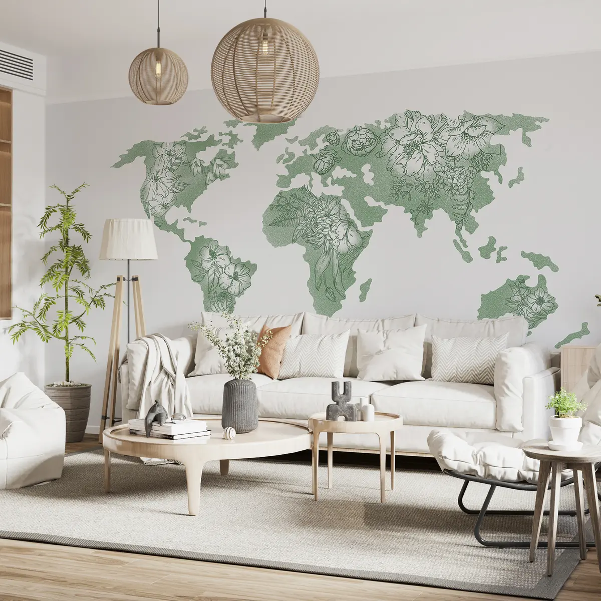 Floral World Map, ornamental, peonies, lily, green color, line drawing art - Wall mural (No. u99734v3)