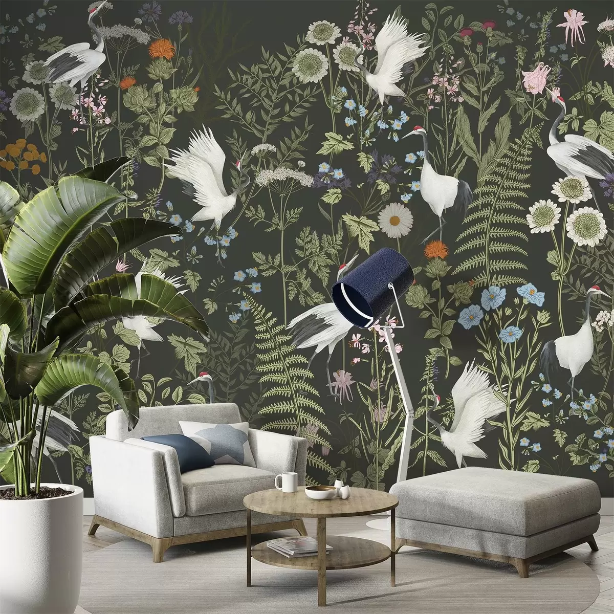Cranes dancing among vibrant flowers - Wall mural (No. w00380v2)