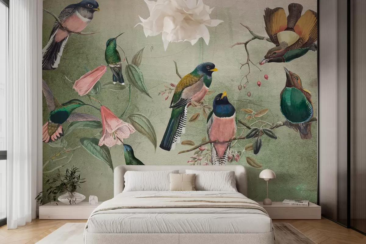 A group of colorful birds perched on branches in the textured background - Wall mural (No. w00543)