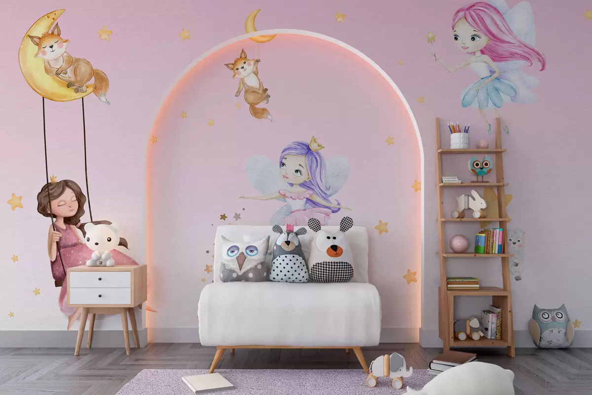 Fairies and cute animals on pink background - Wall mural (No. w00621v1)