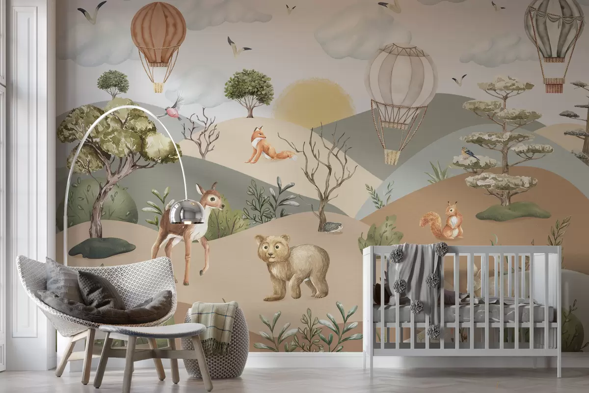Forest glade with cute animals and balloons - Wall mural (No. w00636)