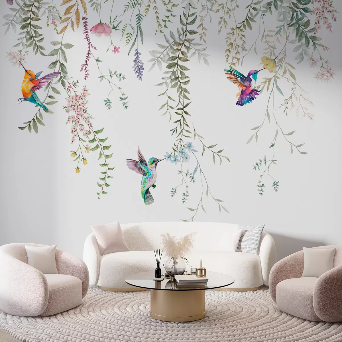 Hanging flowers and leaves and beautiful hummingbirds - Wall mural (No. w00660)